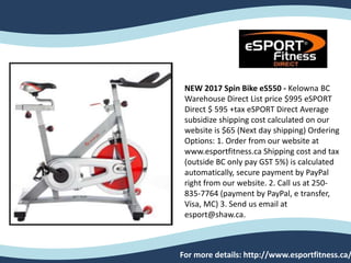 The document promotes fitness equipment available for purchase, including a new spin bike, a tennis table, an adjustable kettlebell, and a commercial incline bench. Each item includes pricing, shipping options, and ordering methods through their website or by phone. The company guarantees customer satisfaction and provides next-day shipping from their Kelowna, BC warehouse.
