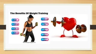 Weight training utilizes weighted bars and dumbbells to oppose the force generated by muscles. It originated in Ancient Greece where athletes trained without equipment by using natural elements. Weight training provides benefits such as improved quality of life, increased strength and bone density, and promotion of fat-free body mass. Today, weight training is commonly performed at gyms which offer various equipment to build strength.