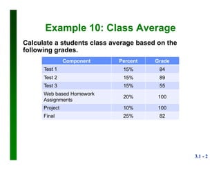 The document describes how to calculate a student's class average based on weighted grades in different components. It provides the component percentages, the student's grades for each component, and shows the calculation of multiplying each grade by its component percentage to get a weighted grade. These weighted grades are summed and divided by the total percentage to get the class average of 84.7, equivalent to a B.