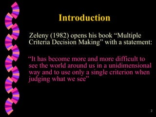 The document discusses multi-criteria decision making (MCDM) approaches, emphasizing the complexity of modern decision-making that often involves multiple objectives, such as safety and cost in public sector decisions. It outlines methods like the Weighted Score Method and the TOPSIS method for evaluating options based on various criteria through systematic processes. Examples provided include selecting a car and the wife selection problem, illustrating how different criteria impact decision outcomes.