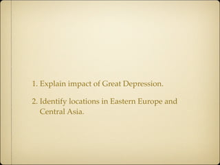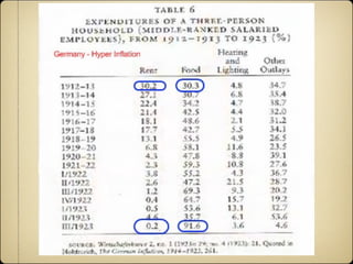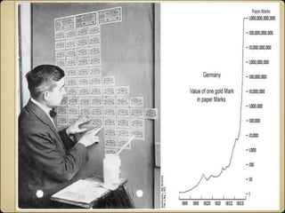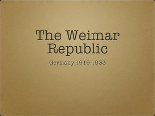The document discusses the Weimar Republic in Germany from 1919 to 1933, focusing on the impact of the Great Depression and the legacy of the Treaty of Versailles. It outlines economic challenges including war reparations, hyperinflation, and the political landscape featuring leaders like Gustav Stresemann. The document concludes with the effects of the 1929 stock market crash on Germany's recovery efforts.