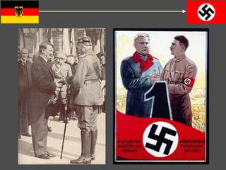 The document summarizes key events in Germany from the end of World War 1 until the Nazis gained control in 1933-1934. It discusses the harsh terms of the Treaty of Versailles, the formation of the Weimar Republic and constitution, economic struggles including hyperinflation in the early 1920s, political instability and rise of extremism in the late 1920s and early 1930s, and Hitler's appointment as Chancellor in 1933 leading to the Nazis consolidating power.