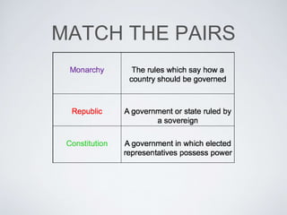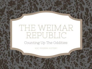 The Weimar Republic was established in Germany after World War 1 and the abdication of Kaiser Wilhelm II. It was governed by a democratic constitution that guaranteed many civil liberties and rights. The President was elected directly by the people and had power to appoint the Chancellor and rule by emergency decree. The Reichstag was elected using proportional representation which weakened governing coalitions. The constitution's protections of liberties and use of proportional representation contributed to political instability under the Weimar Republic.