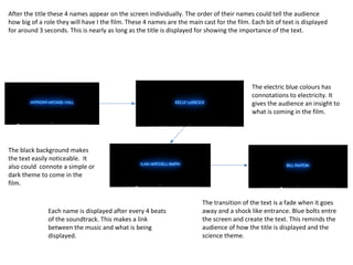 The document describes the opening credits sequence of a science fiction film. The sequence begins with the title displayed prominently in a futuristic font with bright colors and sound effects to draw the audience's attention. Next, the main cast members' names are shown individually for about 3 seconds each to indicate their importance. Smaller roles are also displayed but with multiple names at once. Other credits like casting, costumes, music, and editing are presented in the same style to link all contributors together. The director's name appears last, following the typical convention to signal the start of the film.