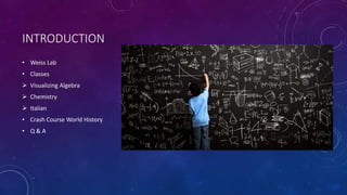 This document summarizes Amelia Payne's spring term exhibition at the Weiss Lab in 2015. It describes some of the classes Amelia took, including Visualizing Algebra, Chemistry, and Italian. It then discusses several projects Amelia worked on at the lab, including harvesting mouse lungs, photographing microscopy slides, testing the pH of washes, and investigating a sodium deoxycholate mystery. The document provides details on these projects and what Amelia learned, such as how to take microscope photos, test pH, and interact with coworkers. It concludes with a thank you to those who helped Amelia learn and a Q&A section.