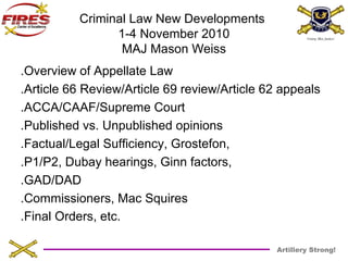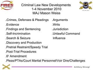 This document provides a summary of topics covered at a criminal law conference from 1-4 November 2010 presented by MAJ Mason Weiss. It discusses recent case law developments pertaining to crimes and defenses, evidence, findings and sentencing, self-incrimination, search and seizure, and pleas and pre-trial agreements. Numerous military court cases are summarized across these topics, with highlights including limitations on what can constitute solicitation and larceny offenses, standards for admitting evidence under Military Rules of Evidence, requirements for specifying findings of guilty, and limits on questioning service members for law enforcement purposes without Miranda warnings.