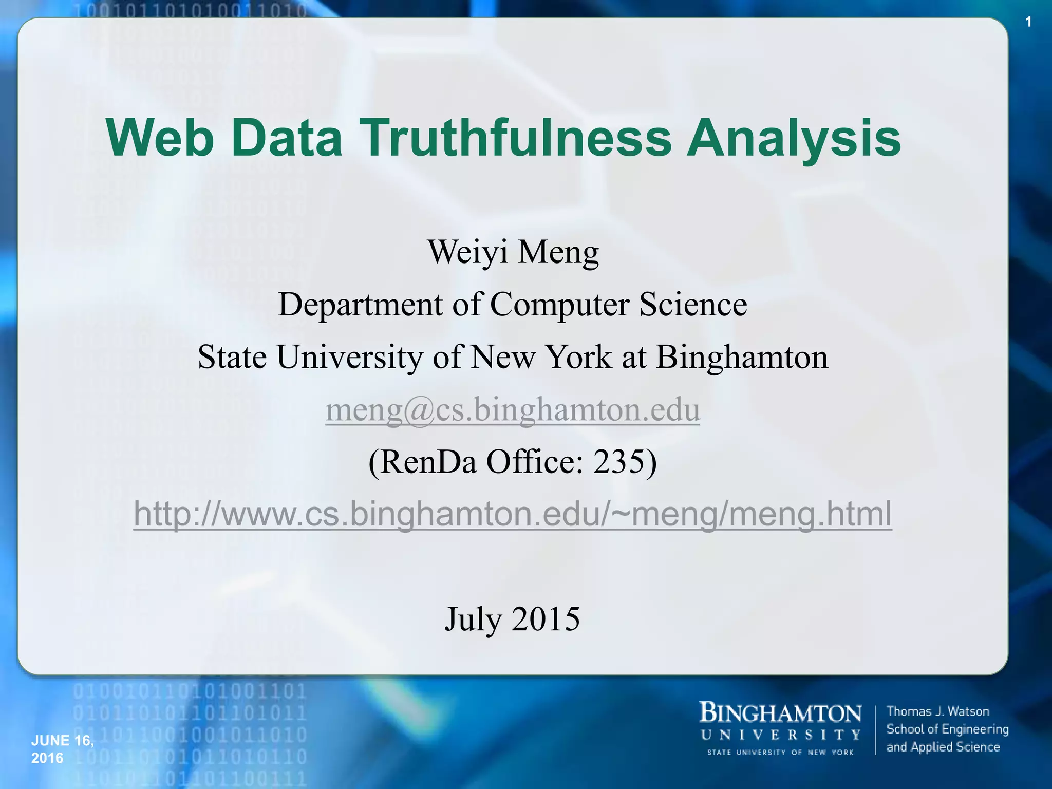 The document summarizes a talk on analyzing the truthfulness of web data. It discusses analyzing structured data from two domains - stock prices and flight statuses - from multiple online sources. It was found that there is a lot of redundant data across sources, but also significant inconsistencies. Various techniques were explored to resolve inconsistencies and find true values, such as voting methods that leverage source accuracy and ignore copied data. Detecting copying between sources is important for improving truth finding but also computationally challenging. Scaling up copy detection methods can help address this challenge.