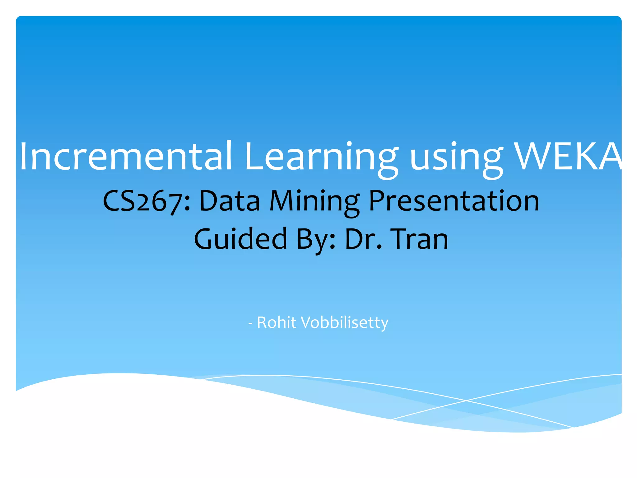 The document provides an overview of incremental learning using Weka, a machine learning software for data mining. It describes the process of training updateable classifiers, utilizing stochastic gradient descent for optimizing large datasets, and includes sample code, results, and challenges faced. The presentation is guided by Dr. Tran and explains key concepts and steps involved in implementing and evaluating models with Weka.