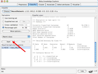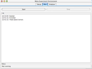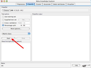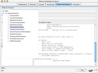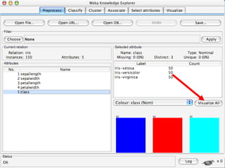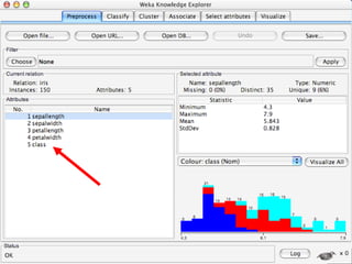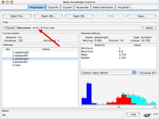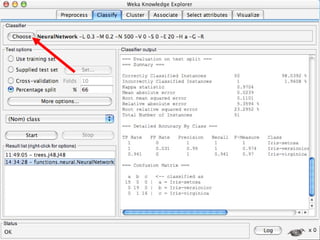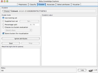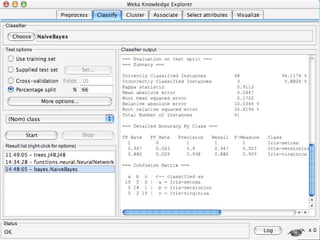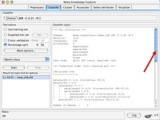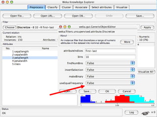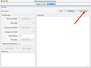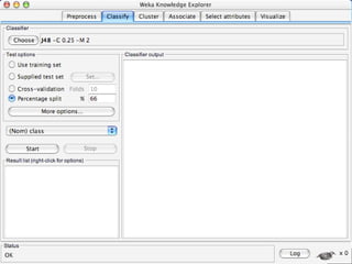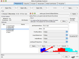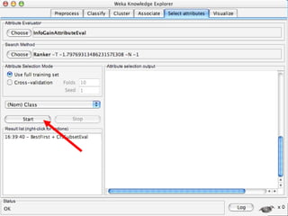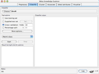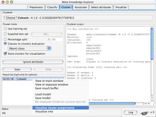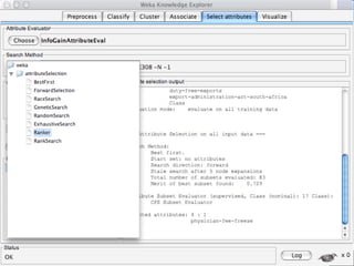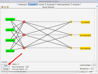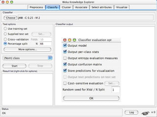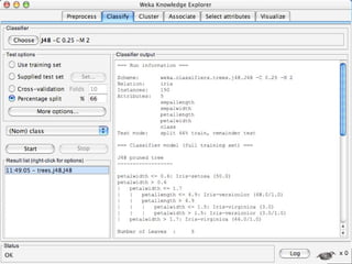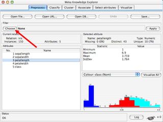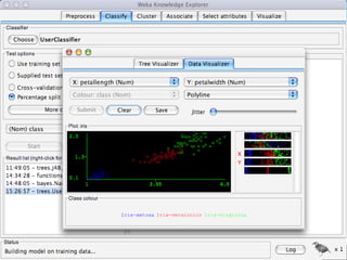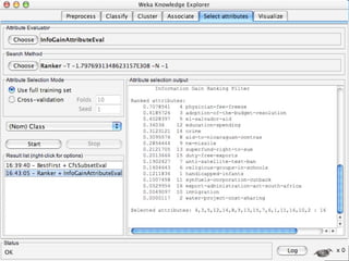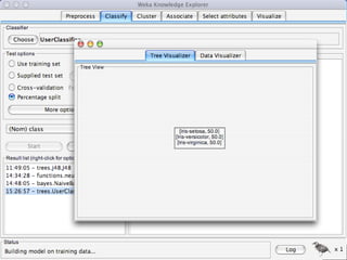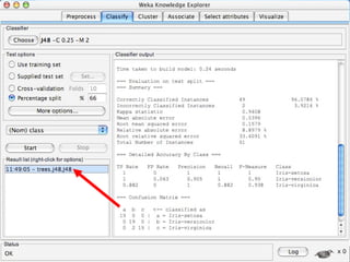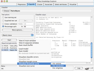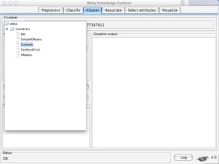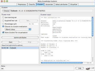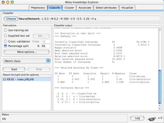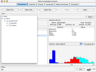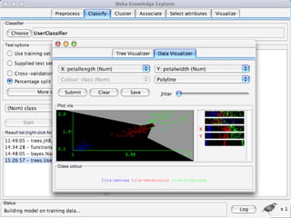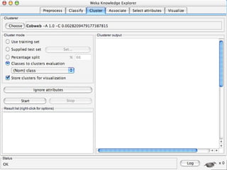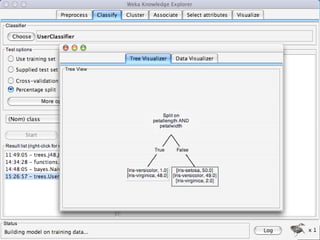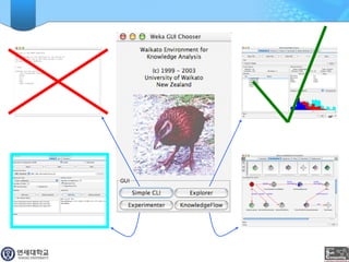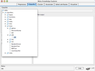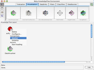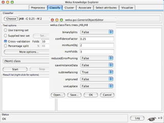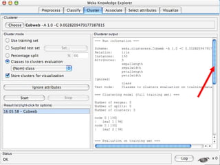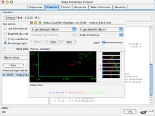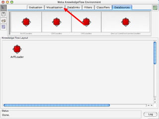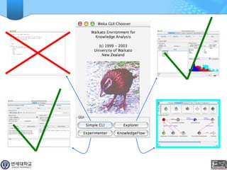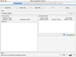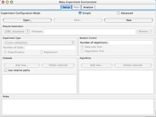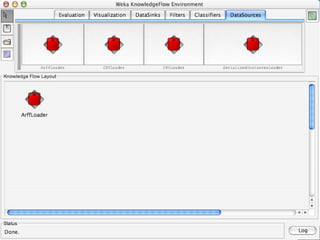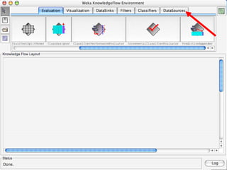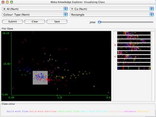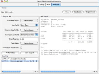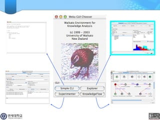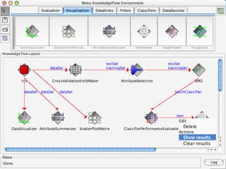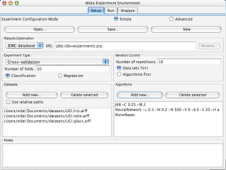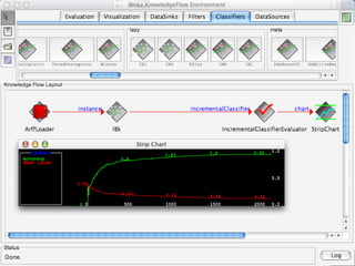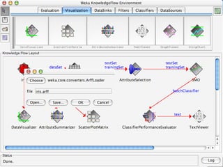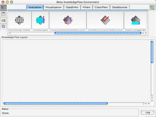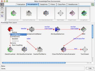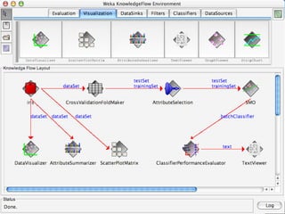 WEKA is a machine learning toolkit written in Java that contains tools for data pre-processing, classification, regression, clustering, visualization, and evaluating machine learning algorithms. It contains algorithms like decision trees, neural networks, and support vector machines. The toolkit includes graphical user interfaces for exploring data and models as well as an experiment environment for comparing machine learning algorithms. WEKA is open source and available for research, education, and applications.