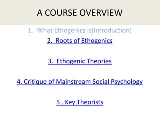 This document provides an overview of a class presentation on ethogenics and discourse analysis. It begins with an introduction to ethogenics, defining it as an interdisciplinary social scientific approach developed by Rome Harre to understand how individuals derive meaning and identity from social norms and cultural resources. The presentation then covers the roots of ethogenics in symbolic interactionism, key ethogenic theories proposed by scholars like Harre, Gergen, and Shotter, and a critique of mainstream social psychology. It concludes by listing some of the main theorists associated with the ethogenics school and emphasizing that language and action are intertwined in this paradigm.