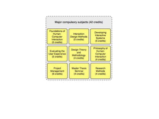 This document provides an overview of interaction design. It discusses that interaction design involves shaping digital products for people's use by addressing instrumental, technical, and aesthetic aspects. It also explores possible futures and involves sketching and other representations. The document then summarizes several design paradigms: user-centered design focuses on user needs; activity-centered design focuses on tasks; systems-centered design focuses on system components; and creator-centered design relies on designer skill. It notes that combining all of these paradigms allows interaction design to realize its full potential. Finally, it lists some core courses in the HCI master's program that cover interaction design, user experience evaluation, developing interactive systems, and research methods.