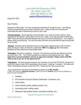 This document contains information from Ms. Snyder, a 5th grade teacher at Louis Sheffield Elementary, for the upcoming school year. It provides details about communication methods, classroom policies on snacks, cupcakes and volunteers. It also includes the classroom behavior system, rules, and expectations for success. The reading log and use of computer programs to enhance instruction are outlined. Parents are asked to sign the bottom to acknowledge receiving and understanding the information.