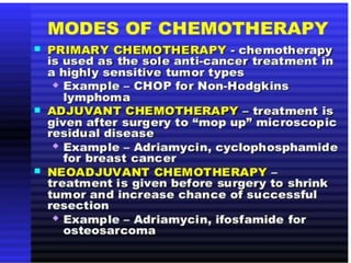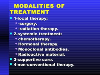 This document outlines an oncology lecture discussing the basic approach to cancer diagnosis and treatment. It will cover understanding cancer staging and how that affects treatment decisions. The lecturer will evaluate different cancer treatment approaches and how treatment decisions are made through a multidisciplinary team.