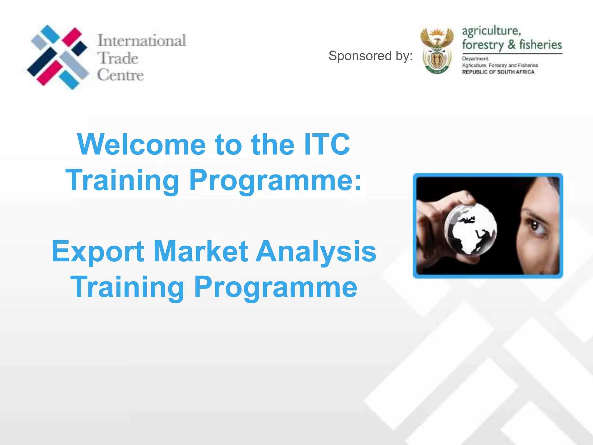 This document provides instructions for accessing and navigating an online export market analysis training programme hosted on the ITC e-learning platform. It details how to log in using provided credentials, browse course modules and features during the introductory Week 0, engage with other participants and trainers using communication tools, and get help by posting questions to forums or contacting support.
