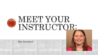 This document provides information from Mrs. Strickland about her Spring 2017 Geometry course. It includes her contact information and office hours. It outlines the academic policies regarding plagiarism, conduct, attendance, and withdrawals. It provides details about course requirements, technologies needed, grading policies, pacing, and the final exam. The goal is to ensure students have the resources and understanding to be successful in the online course.
