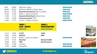 This document appears to be an agenda for an event called OPEN16 taking place on September 29, 2016. It lists the schedule of rooms and topics to be covered that day, including tracks on CI/CD and DevOps, infrastructure, Linux history, containers, OpenStack, container managers, and monitoring/logging. There are also sections for an open source year in review and annual survey, information about the event organizers, and a customer panel.