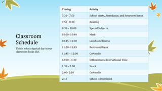 This document outlines the daily schedule and procedures for Ms. Robinson's classroom. It includes the timing of activities like reading, math, lunch, and recess. It also discusses getting to know the classroom rules and expectations, homework and signed paper procedures, tardiness policies, and a scavenger hunt to learn the school. The overall purpose is to introduce students to the structure and routines of the classroom.