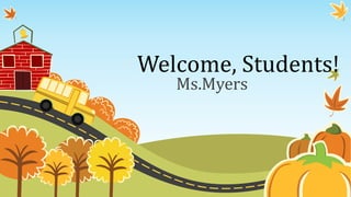 The document outlines the daily schedule and curriculum for a classroom. It introduces the teacher, Ms. Myers, and provides an overview of the subjects covered, including reading, writing, math, science, social studies, music and art. Key aspects of the class are 45 minutes of daily homework, field trips planned throughout the year, and classroom rules to foster a respectful learning community. Students are asked to bring pencils each day and can get help from various resources like the library, computer lab, teacher's aide and parent volunteers. The document encourages questions and hopes for a great year of learning.