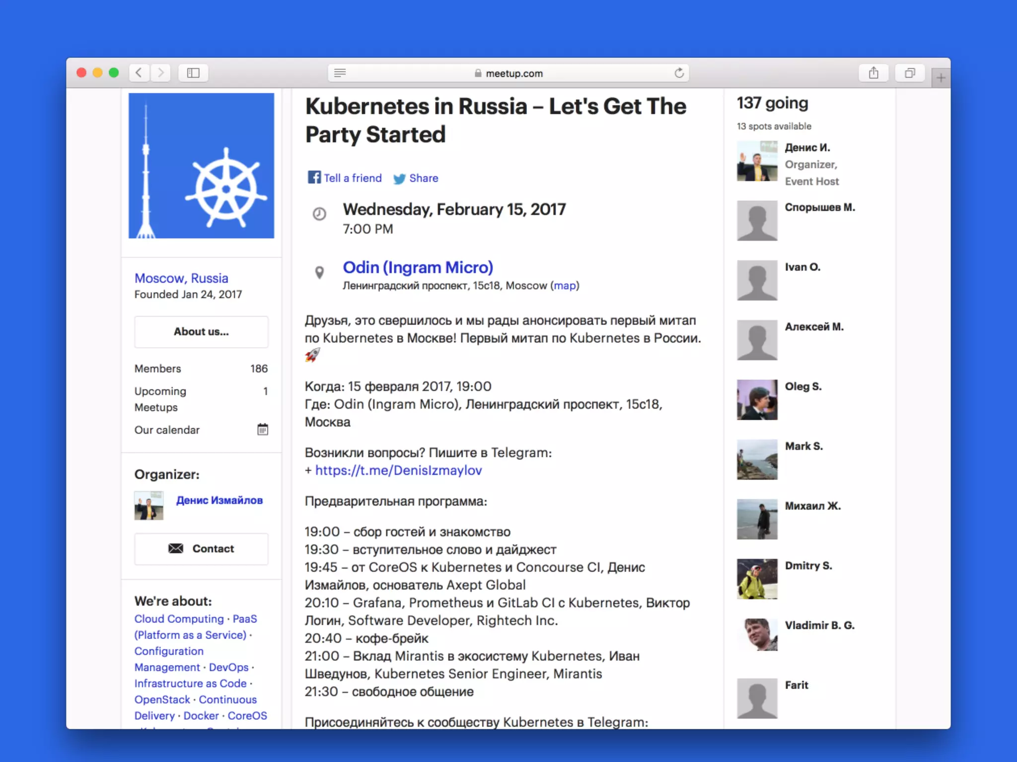 The document outlines a schedule for an event featuring discussions on Kubernetes, including topics like migrations and integrations with tools such as Grafana and GitLab CI. Key speakers include Denis Izmaylov, Victor Login, and Ivan Shvedunov, followed by a Q&A session and networking opportunities. The event emphasizes the strong community support and Google’s long-term investment in Kubernetes development.
