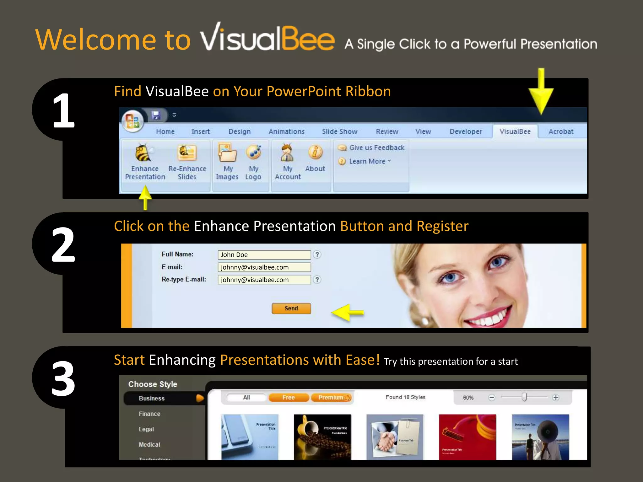 The document provides instructions for using the VisualBee tool within PowerPoint. It explains that users should click the Enhance Presentation button on the ribbon to register their account with VisualBee. Once registered with their email, VisualBee welcomes the user and allows them to start enhancing presentations with ease using sample slides that demonstrate how VisualBee can automatically and easily change visual elements like appearances, structures, backgrounds and pictures on slides.