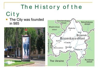 Bryansk was founded in 985 and offers many historical and cultural sites to visit including the Pokrovsky Hill, Partisan Square, and Burial-Mound of Undying Glory in the downtown area. The city is also home to cultural institutions like the Bryansk Drama Theater, Bryansk Museum of Regional Ethnography, and a circus located near the Park-Museum named after A.K. Tolstoi. Bryansk has universities and the JSC "Bryansk Machine-Building Plant" as well as the Svensky Monastery and towns of Ovstug and Dyatkovo nearby.