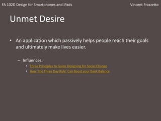 The document describes the design process for a budgeting app called Budgee. It aims to help users reach savings goals by passively tracking purchases and determining potential savings. The designer observed users' unconscious spending habits and wants the app to make purchases more conscious. An ideation session provided feedback from housemates. Research on Mint, You Need a Budget, and Unsplurge informed the app's design. It will aggregate finances, utilize a goal-oriented savings algorithm, and feature interactive bill pay and investments. Wireframes and visual scenarios demonstrate the app's design and user experience.