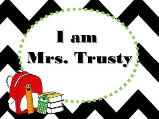 Mrs. Trusty is an 11th year teacher who teaches Challenge class. She has three children and a dog named Biscuit. She loves to read mysteries, learn new things, and run long distances. The three main classroom rules are to be positive, responsible, and respectful. Students will be rewarded with dojo points that can be exchanged for prizes like candy or computer time. The class blog updates weekly on unit work like Shakespeare, bridges, and iconic America.