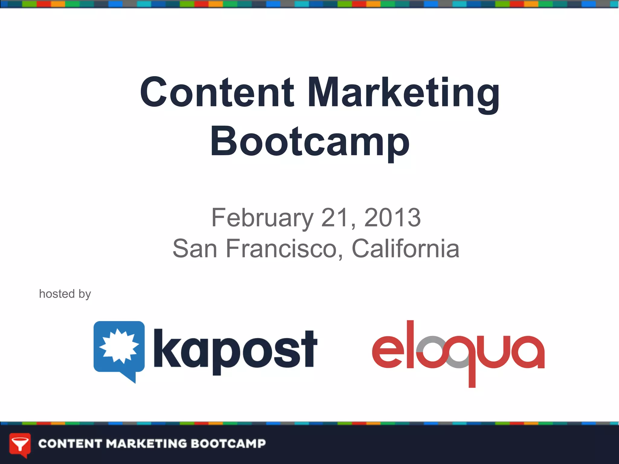 This document provides an agenda for a content marketing bootcamp being held on February 21, 2013 in San Francisco. The bootcamp will include presentations on transforming brands into media companies, thinking like a publisher, building a content marketing machine, managing the top, middle and bottom of the marketing funnel with content, and case studies from Intel and Cengage. Breaks and lunch are scheduled between the presentations.