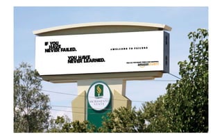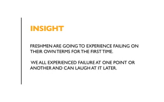 The document promotes a campaign called 'Welcome to Failure' aimed at freshmen, encouraging them to embrace failure as a step towards success. It outlines strategies for social media engagement, including sharing short videos of failures and utilizing hashtags, while highlighting the convenience of Amazon's free 2-day shipping for replacing items. The initiative aims to create a positive narrative around failure and foster a supportive community among students.