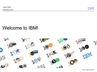 This document provides an overview of IBM for Henrik Dalin. It discusses IBM's history starting in 1911 in the US and expanding to Sweden in 1928. It now has over 400,000 employees working in 170 countries, and had $100 billion in revenue in 2010. The document also summarizes that IBM focuses heavily on research through its 4000 researchers across 9 facilities, publishing numerous reports, and receiving several Nobel Prizes. It describes IBM's structure and business groups.