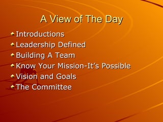 The document summarizes the agenda and key topics from a two-day Illinois LeaderCorps leadership training. The training covered introductions, defining leadership, building a team to achieve goals, committees and their procedures, and networking. It emphasized empowering others, clear vision and goals, communication, and working as a team to accomplish more through partnerships.
