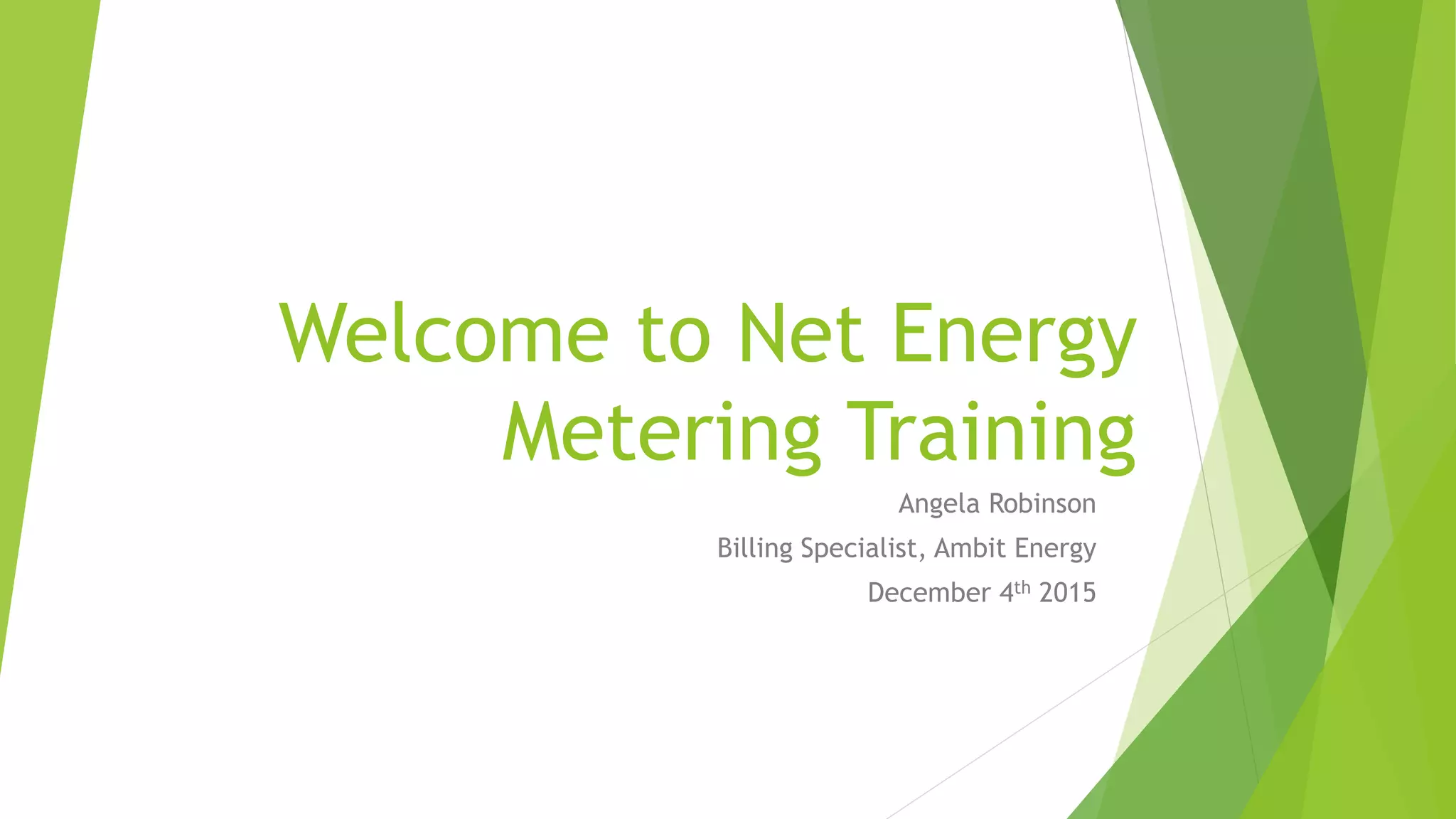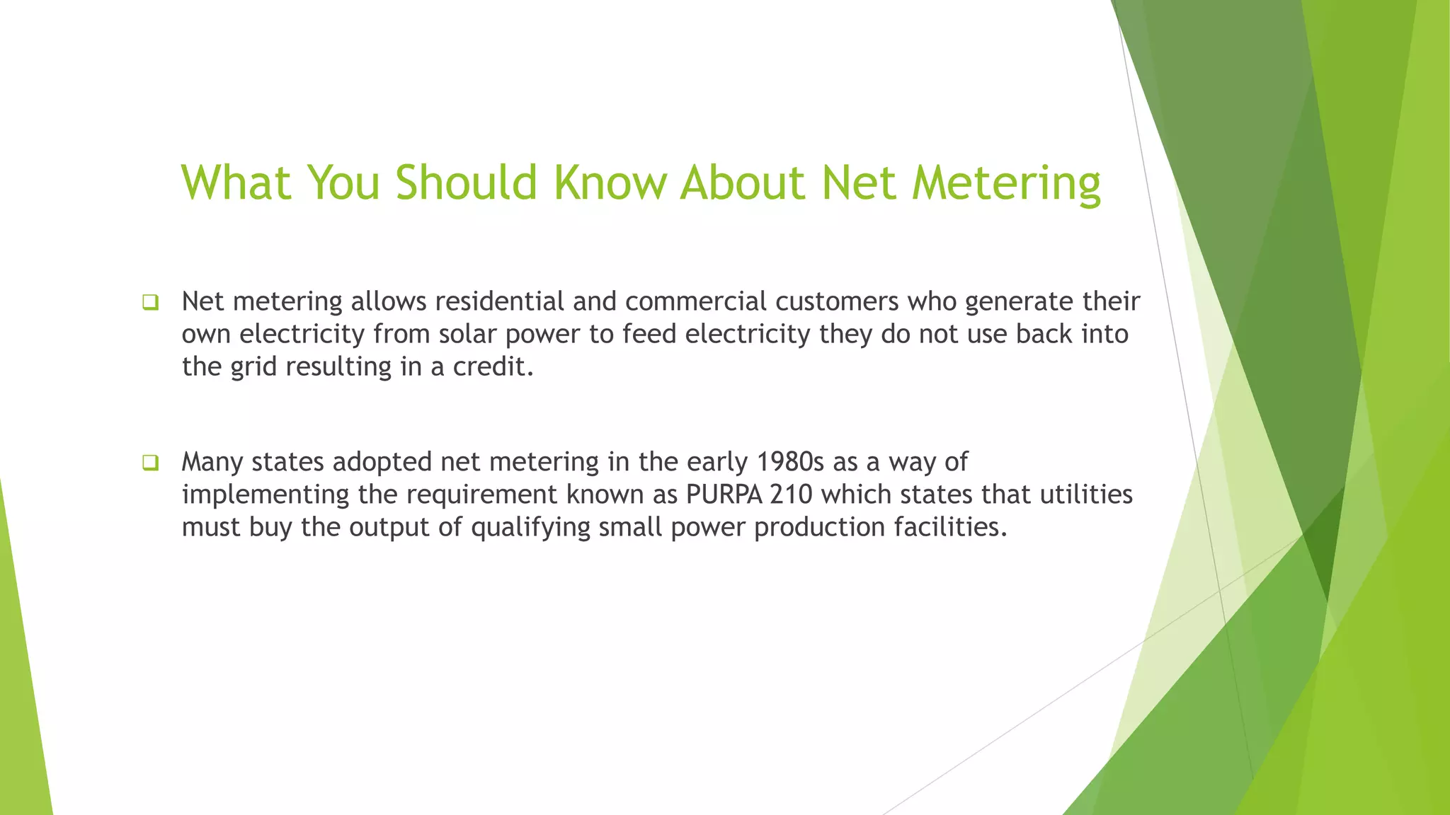 This document provides an overview of net metering for residential and commercial customers generating their own electricity from solar power. It discusses how excess electricity generated can be credited back to the customer's account. It also addresses how generation and consumption data is communicated via EDI transactions to energy suppliers, appropriate installation sizes, and annual or monthly true-up periods across different utility territories.