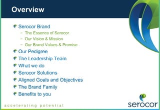 Serocor is a specialist technology and engineering human capital management group operating internationally. Its vision is to help talented and ambitious people reach their full potential through genuine partnership and shared success. Serocor's leadership team has over 80 years of experience building human capital companies from startups to large listed entities. Serocor provides the infrastructure, corporate structure, capital, and expertise to help subsidiary managing directors grow successful recruitment, consulting, and training businesses while maintaining the autonomy of a smaller company.