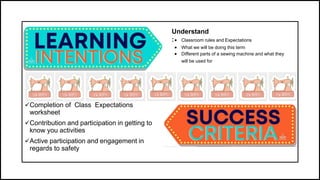 The document outlines safety procedures and classroom expectations for a textiles and design course, emphasizing the importance of obtaining a sewing license by demonstrating machine use. Students will learn to operate sewing machines safely and complete a tasks booklet to earn their licenses while adhering to strict safety protocols to prevent accidents. Safety tips include proper machine operation, maintaining a clean workspace, and careful handling of tools to protect against injuries.
