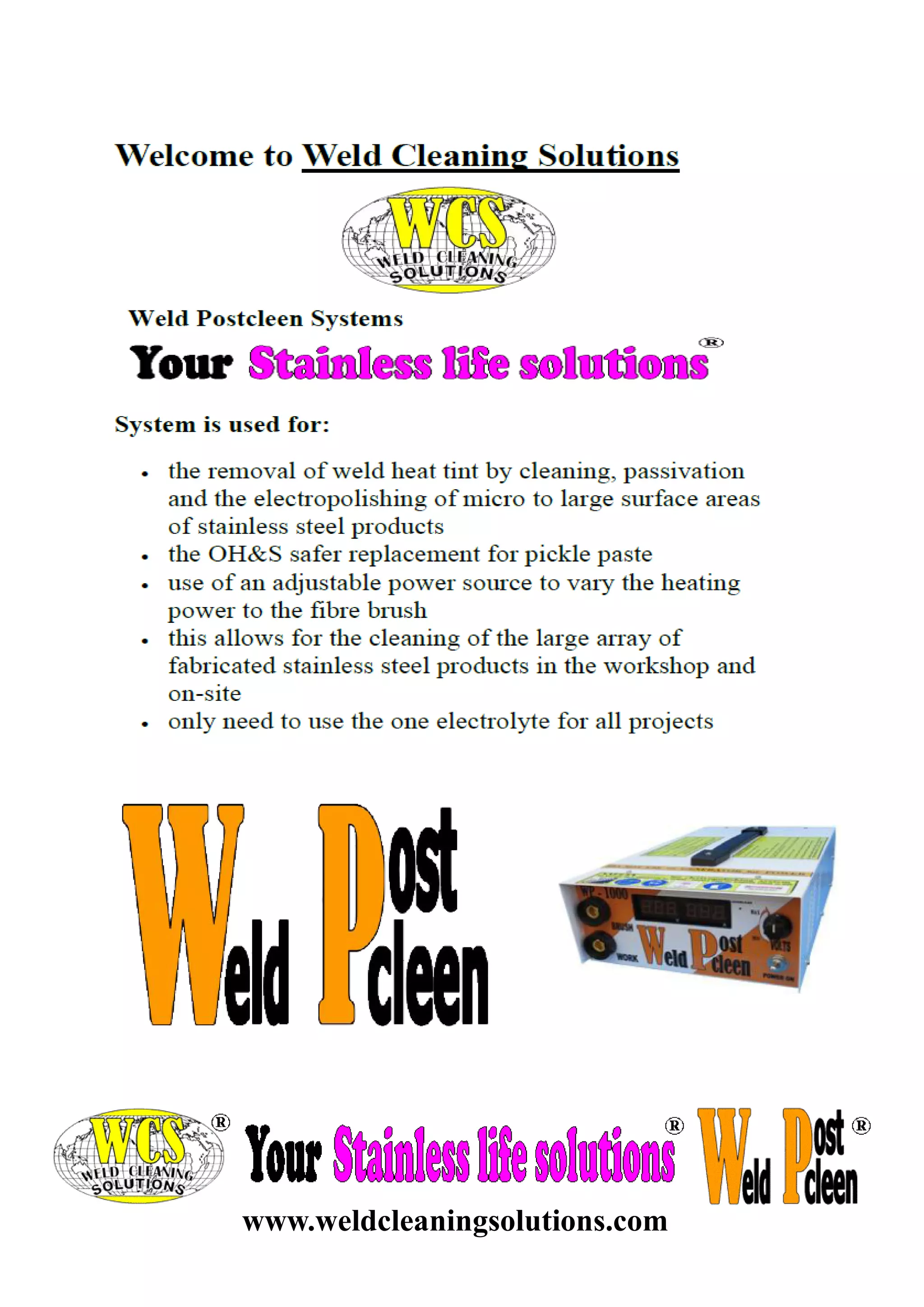 This document describes weld cleaning solutions' portable stainless steel surface cleaning systems for small and large areas. It offers variable output power supplies and a range of fiber brushes for cleaning, passivating, and electropolishing. Special pricing is listed for 1000W and 2000W systems, which come with free electrolyte. Round and wide brush sizes are also listed. Contact information is provided for inquiries.