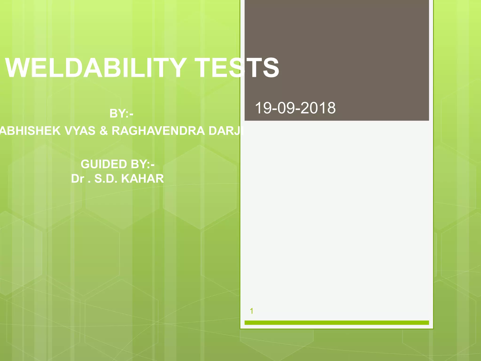 The document discusses weldability, which refers to the ability of materials to be welded into structures that perform satisfactorily in service, focusing on factors like metallurgical compatibility and mechanical soundness. It outlines various weldability tests, their classifications, and the significance of actual welding tests over theoretical or simulated tests to assess material performance under practical conditions. Additionally, it details specific testing methods for both fabrication and service weldability, including hot and cold cracking tests, along with different forms of cracking and their assessments.