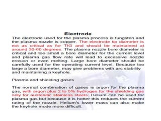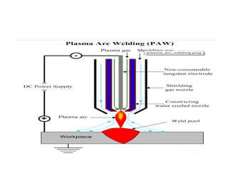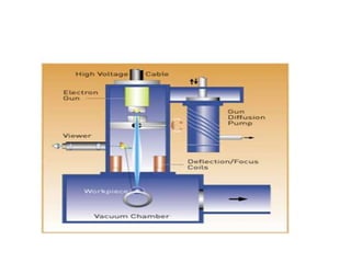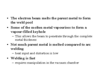 Electron beam welding uses a beam of electrons accelerated by high voltage to melt and join materials. It can achieve deep penetration with minimal heat input. It produces a clean, homogeneous weld in a vacuum environment without filler metals or shielding gas. However, it requires expensive equipment and a vacuum chamber. Laser beam welding uses a focused laser beam to melt materials. It has high travel speeds but requires precise part fit-up and positioning. Solid state welding joins materials without melting through processes like friction, diffusion, or ultrasonic welding. This reduces heat effects but is limited in applications. Plasma welding uses an arc struck in an externally-supplied ionized gas to produce high temperature for welding metals.