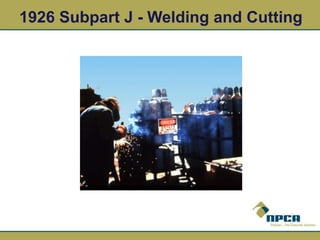 This document outlines safety regulations and requirements for welding and cutting as per OSHA Subpart J, including guidelines for the handling and storage of gas cylinders, inspection protocols for hoses and torches, as well as risks associated with exposure to fumes and noise. Specific procedures for securing cylinders, managing gas pressures, and preventing fire hazards are detailed. The document emphasizes the importance of proper safety measures to protect workers from physical injuries and health hazards related to welding activities.
