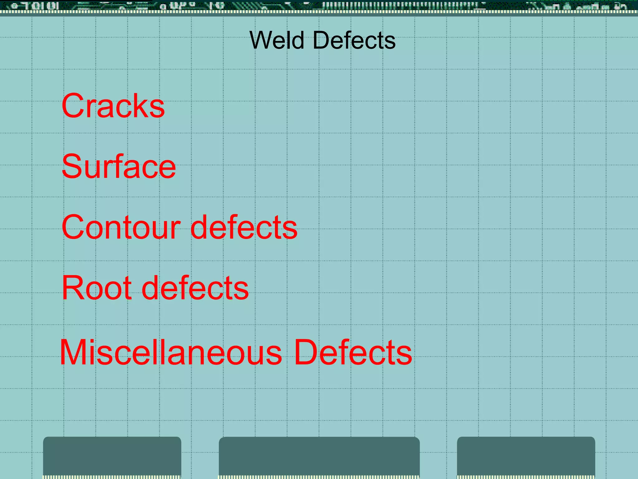 The document discusses various welding defects including cracks, surface defects, contour defects, root defects, and miscellaneous defects. It provides details on specific types of each defect such as undercut, overlap, incomplete root fusion, gas porosity, slag inclusions, and their potential causes like incorrect welding technique, contamination, or material defects. Various repair methods are also mentioned such as grinding, chipping, and arc air gouging.