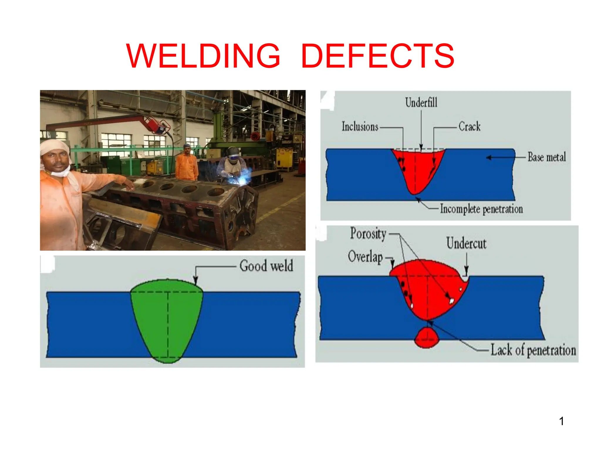 The document outlines the objectives, definitions, and processes related to welding defects, emphasizing their causes, implications, and classifications. It discusses various welding processes, their application in different contexts, and the significant impact of defects on the integrity and safety of welds. Additionally, it categorizes common welding defects and their causes, highlighting preventive measures and repair strategies.