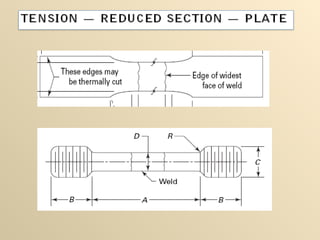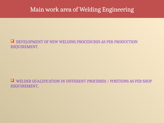 The document outlines the processes and qualifications related to welding engineering, specifically focusing on the development of welding procedures and welder qualifications based on shop requirements. It details various welding processes, essential and supplementary variables, and p-number groupings for different base metals to standardize procedure qualifications. Additionally, it covers welder performance qualifications through specific welding positions and filler metal classifications.