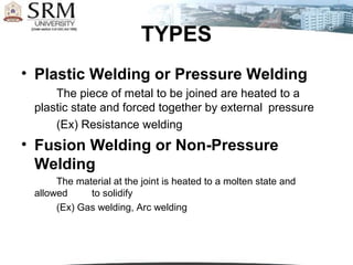 Welding is a process that joins materials by heating them to melt or soften them and allowing them to cool, forming a permanent bond. It is commonly used to join metal parts in manufacturing. Some key types of welding include arc welding, gas welding, resistance welding, and solid state welding. Welding is used in many industries such as automotive, aerospace, shipbuilding, and construction.