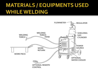 The document discusses various welding processes including arc welding, gas welding, plastic welding, and fusion welding. It provides details on common arc welding techniques like shielded metal arc welding, submerged arc welding, and gas metal arc welding. The document also covers gas welding processes using oxy-acetylene, oxy-hydrogen, and air-acetylene flames. It discusses the equipment, applications, advantages and disadvantages of different welding methods.