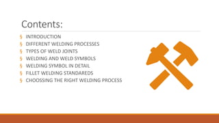 The document provides an overview of welding processes, including types of welding such as gas, arc, and resistance welding. It explains the principles and applications of various welding techniques, the importance of choosing the right welding process based on several factors, and offers guidance on weld symbols and standards. Additionally, it highlights best practices for fillet welding standards and provides insights on evaluating appropriate welding methods for specific materials and conditions.