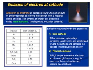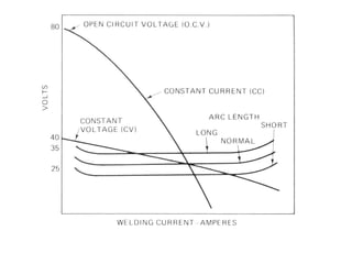#49 The graphical method of voltage-current characteristics is very useful for the study of welding arcs. The voltage-current characteristic of an arc can be obtained by measuring arc current and voltage for different power source settings, while holding arc length constant. This is easy to do for a tungsten arc - more problematical for a metal arc. The characteristic differs greatly from the linear characteristic of an ideal resistor. The nonlinear characteristic of the arc makes graphical V-I analysis of arc circuits more appropriate than mathematical analysis. The characteristic rises to a high voltage at zero current, representing the voltage required to start the arc. The voltage to operate the arc drops with increasing current to around 100 amperes. It then rises at a slow rate. To some approximation over the medium current range, an arc almost operates at a constant voltage independent of current. This constant voltage tendency of the arc is one thing that makes it an unusual electrical load.