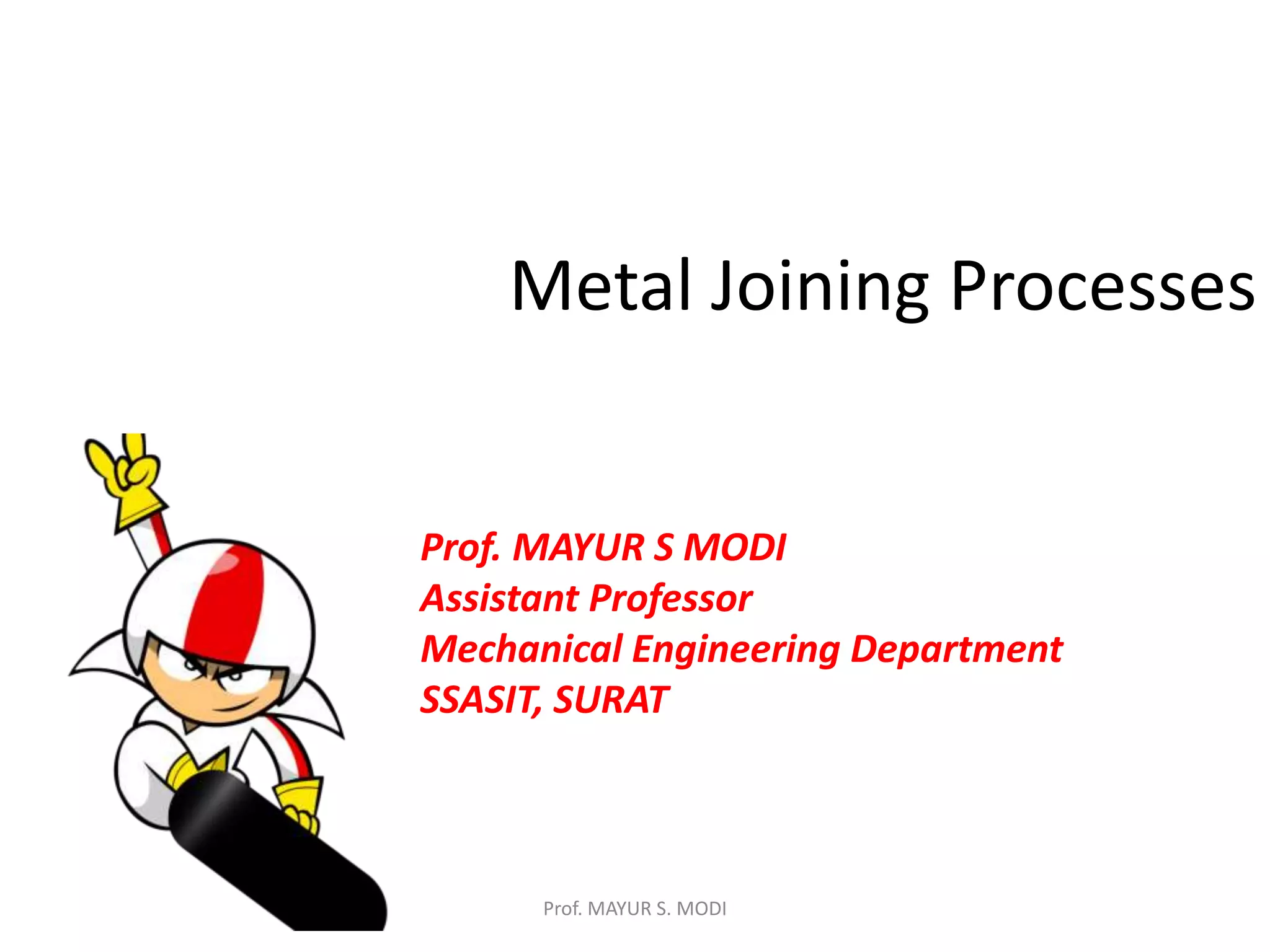 The document discusses various metal joining processes including welding. It begins by defining welding and outlining the key principles of heat and pressure used to join metals. The document then categorizes and describes different types of arc welding processes like metal arc welding, flux-cored arc welding, gas tungsten arc welding, and gas metal arc welding. It also covers gas welding processes like oxy-acetylene welding and discusses terminology, applications, advantages, and limitations of welding.