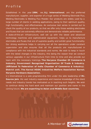 U.J. International, established in 1994, is a leading manufacturer, supplier, and exporter of welding electrodes and fluxes, renowned for their quality and effectiveness. The company offers a diverse range of products tailored for various welding applications, backed by rigorous quality checks and advanced technology. Under the leadership of Mr. Gaurav Jain, U.J. International focuses on continuous improvement and adherence to industry standards while expanding its market reach in Asia and the Middle East.