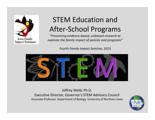 - In Iowa, over half of K-12 students are not in after-school programs despite high demand. The state is working to expand access to quality after-school STEM programs through its Regional STEM Network and Scale-Up initiative. Evaluation finds these efforts have increased student interest and achievement in STEM.