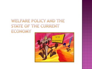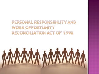 The document summarizes key aspects of the 1996 welfare reform act: It ended entitlements to welfare, implemented a block grant program, and imposed work requirements and lifetime limits on benefits to cut welfare programs. It also replaced the Aid to Families with Dependent Children (AFDC) program with the Temporary Assistance for Needy Families (TANF) program. Interest groups, Congress, and the bureaucracy influenced both the formation and implementation of the reform act through lobbying, elections, and regulatory policies.