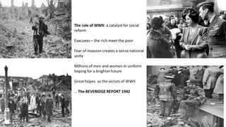 The document summarizes the creation of the welfare state in the UK between 1945-1951. It discusses the historical context including proposals from the Liberal party in the early 1900s. It then covers the 1942 Beveridge Report which laid out reforms to address unemployment, poverty, illness, ignorance, and poor housing conditions. This led to the 1945 election where the Labour party campaigned on implementing the Beveridge Report and established the welfare state by passing reforms for social security, healthcare, education, housing, and employment. However, problems with reforms contributed to the Conservatives regaining power in 1951.